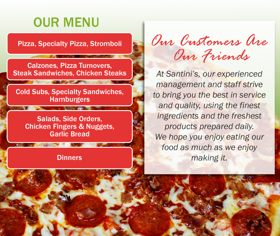 Santini's Pizza 408 East Church St Blackwood, NJ 856-228-8008 Delicious pizza, steaks, sandwiches and more for delivery, dine-in or take out